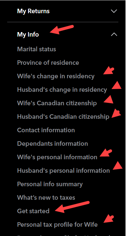 Depending on which section you wish to see, here is an image of the menu on the left hand side in your return showing the beginning of the information collected. The TurboTax Online software will guide you through each section alternating between you and your spouse to help you enter your information. You may wish to go back to the Get Started link seen in the image.