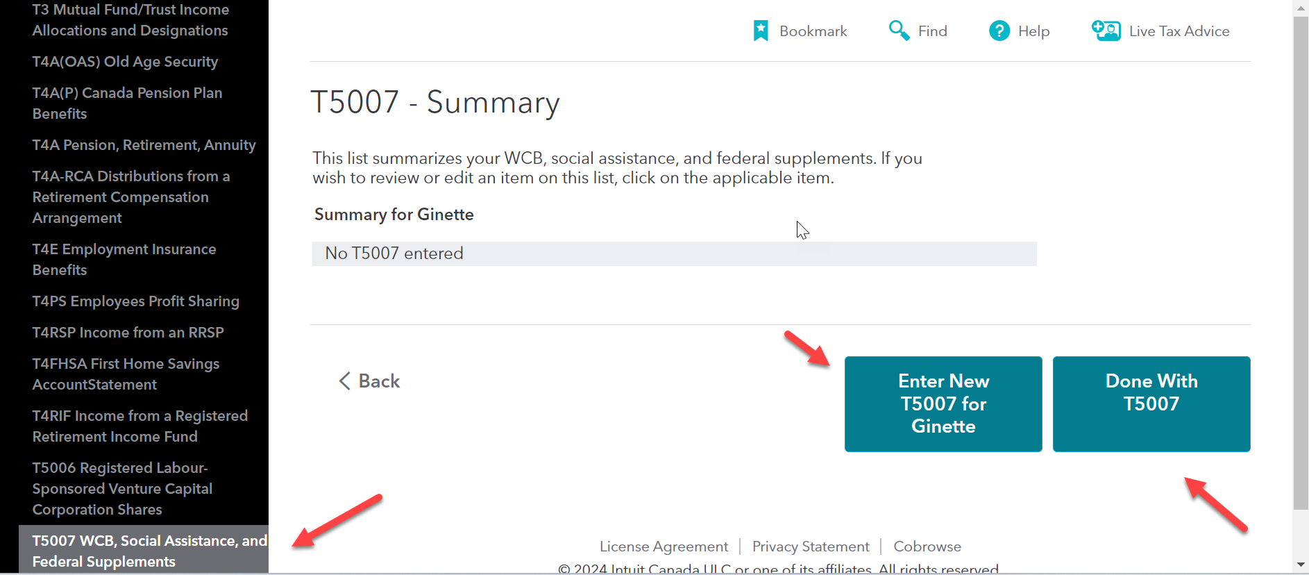 T-slips then scroll down to click on T5007 WCB, Social Assistance, and Federal Supplements. You will then click on Enter New T5007 for ____ to enter your information slip and then click Done With T5007 to save the information. Please see the image below.