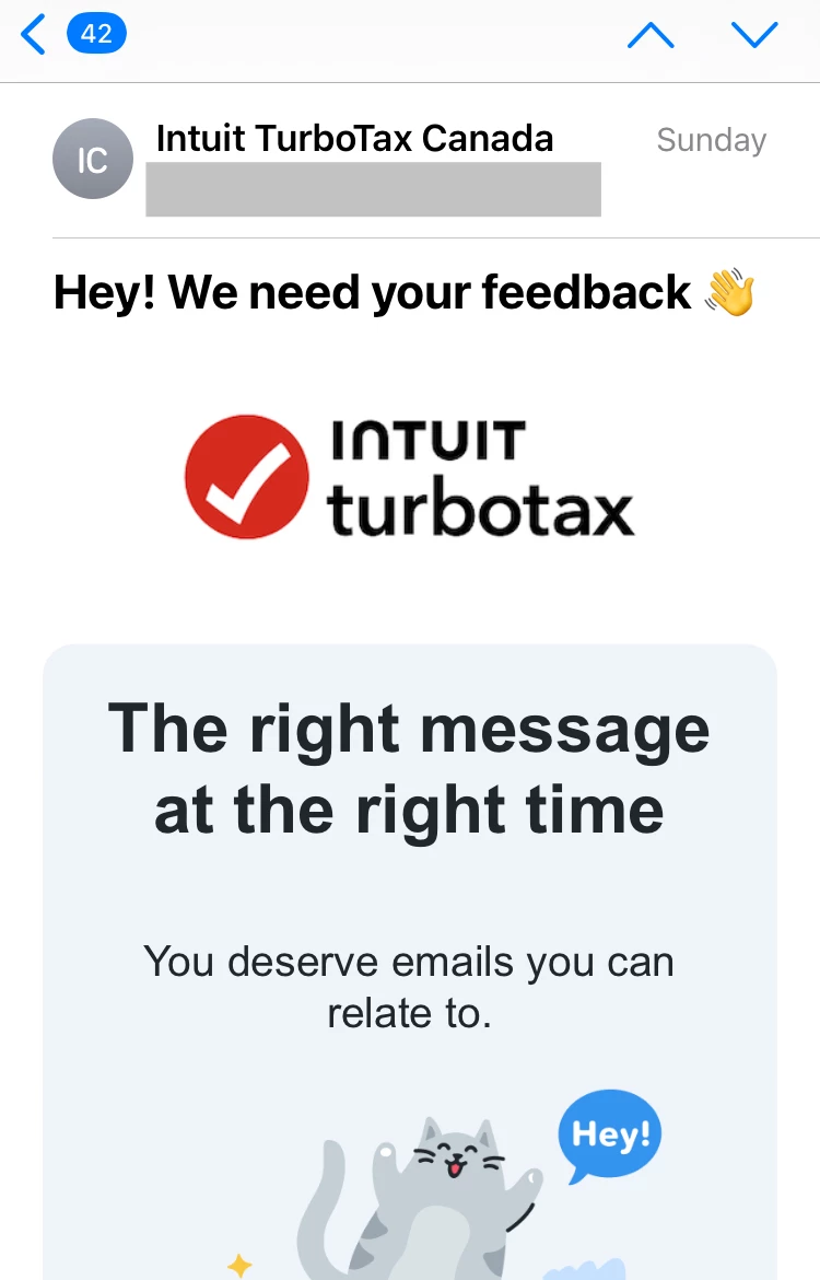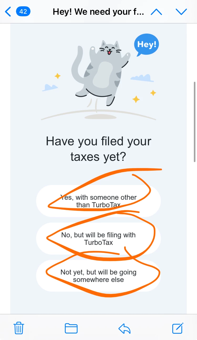 Hi there. I recently filed my 2023 taxes using TurboTax. I received the following email from Intuit asking for feedback. There are 3 options: yes but not using TurboTax, no but plan to use TurboTax, no but not using TurboTax. Screenshot attached.