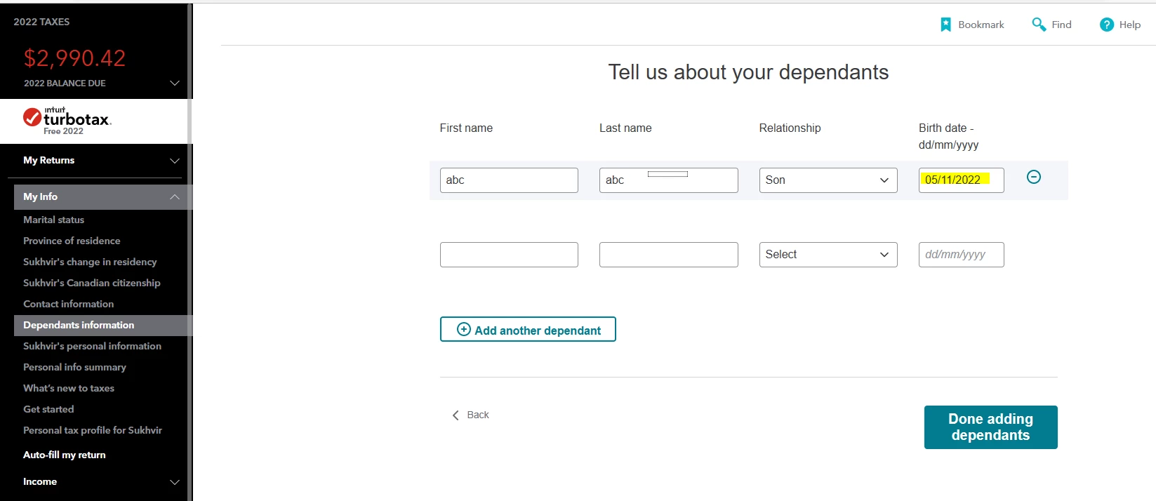 the turbo tax says "only add dependents prior to or during the tax year for the return you are preparing