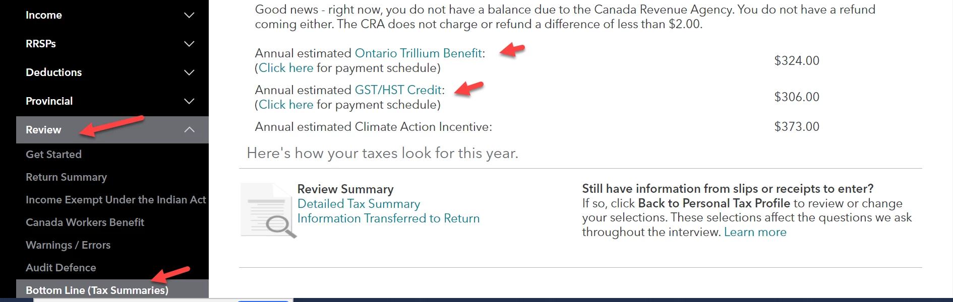 Your refund amount is calculated based on your overall financial picture. This picture includes your total income, the taxes you’ve paid throughout the year, and whether you have enough deductions and other credits to warrant a refund. It never hurts to follow up with the Canada Revenue Agency (CRA) on unused deductions you can carry forward to future years. If you are to receive a refund, you can see it at the top of the black menu on the left.