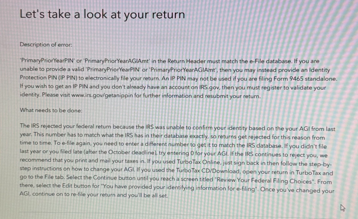 If you file your taxes and it gets rejected for no 2023 AGI, how do you re input it? I found the AGI value but when I go to refile, it never gives me an option to input an AGI. Do I just re file completely? Attached is the error