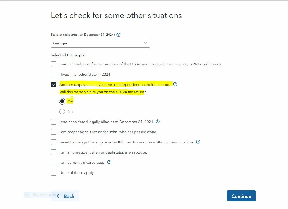 For your dependency status, on the screen Let's check for some other situations, check or un-check the box Another taxpayer can claim me as a dependent on their tax return.