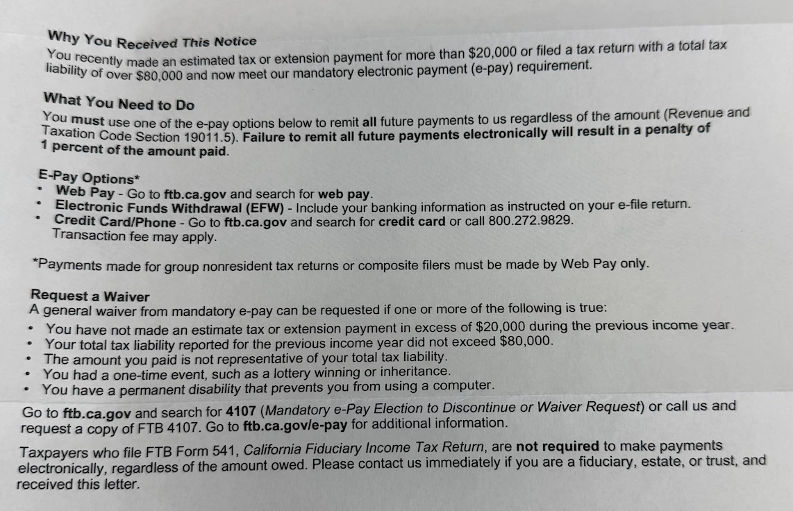 I received a letter from State of California Franchise Tax Board.  I have been my taxes via e-file TurboTax. Please confirm if this means that I would need to continue to e-file via TurboTax the same way from next year onwards for 2025 taxes, and if that would be sufficient to satisfy this instruction. I don't need to do anything about it this year, right? I don't send my tax payments via check or mail anyway. Just making sure I follow the intructions accurately. Thank you!