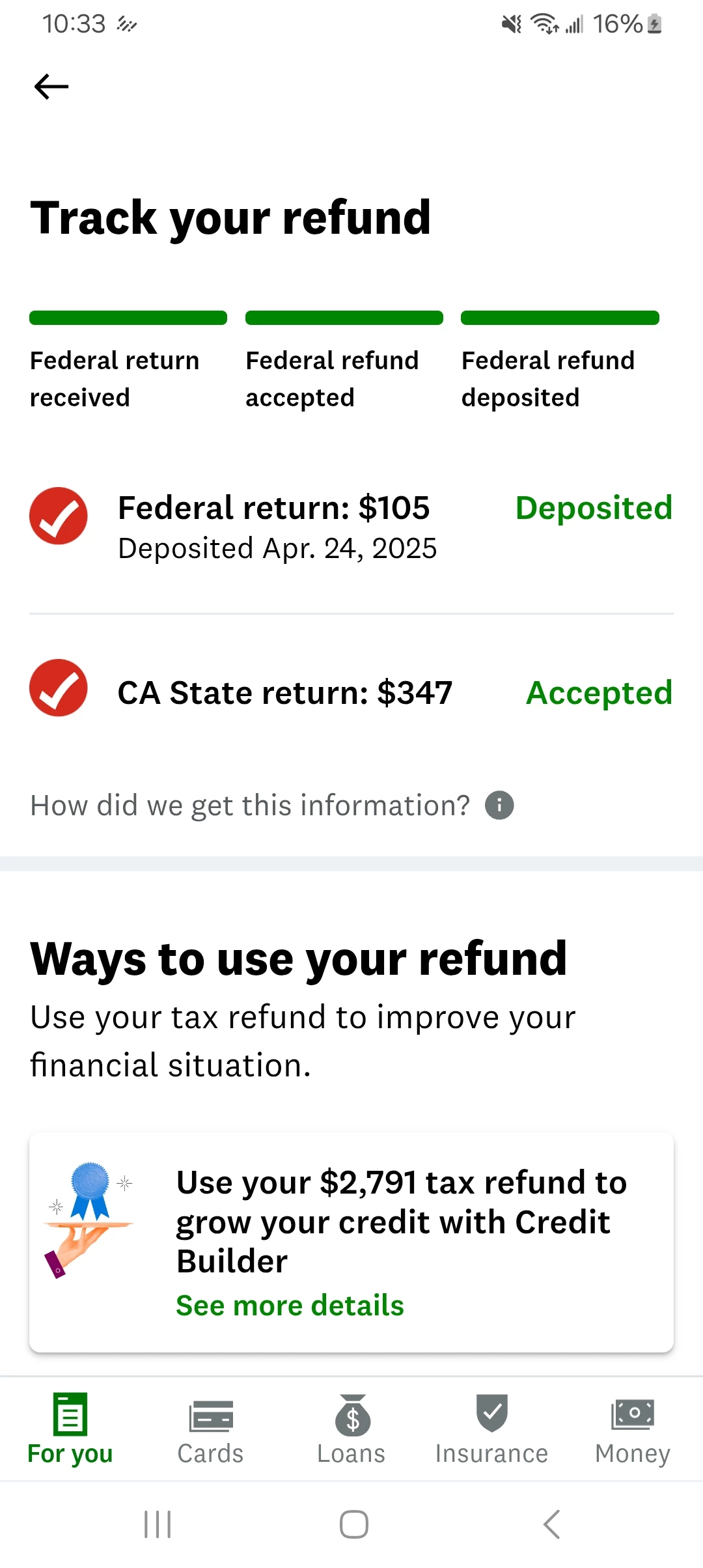 For the status of your tax refund you will need to contact the third party processor, Santa Barbara Tax Product Group, using their website - https://www.sbtpg.com/