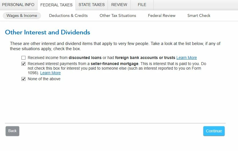 Under other Interest and dividend there is a check mark I can't remove. And i didn't put it there. When I check off none of the above it still won't go away.