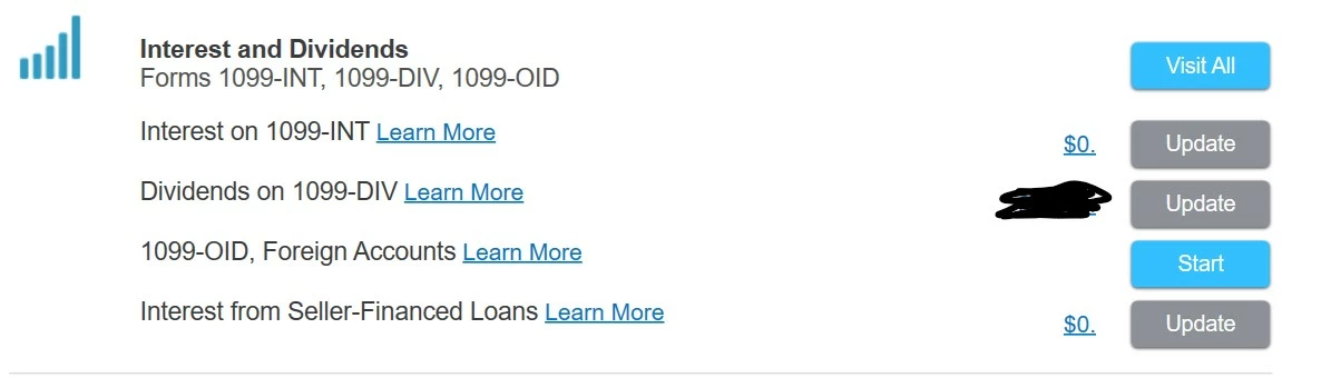 Likewise, when I'm entering additional interest income, the button is gray for any area I've visited previously, such as Interest Income, and it's marked Update so I can click on that if I need to make changes.