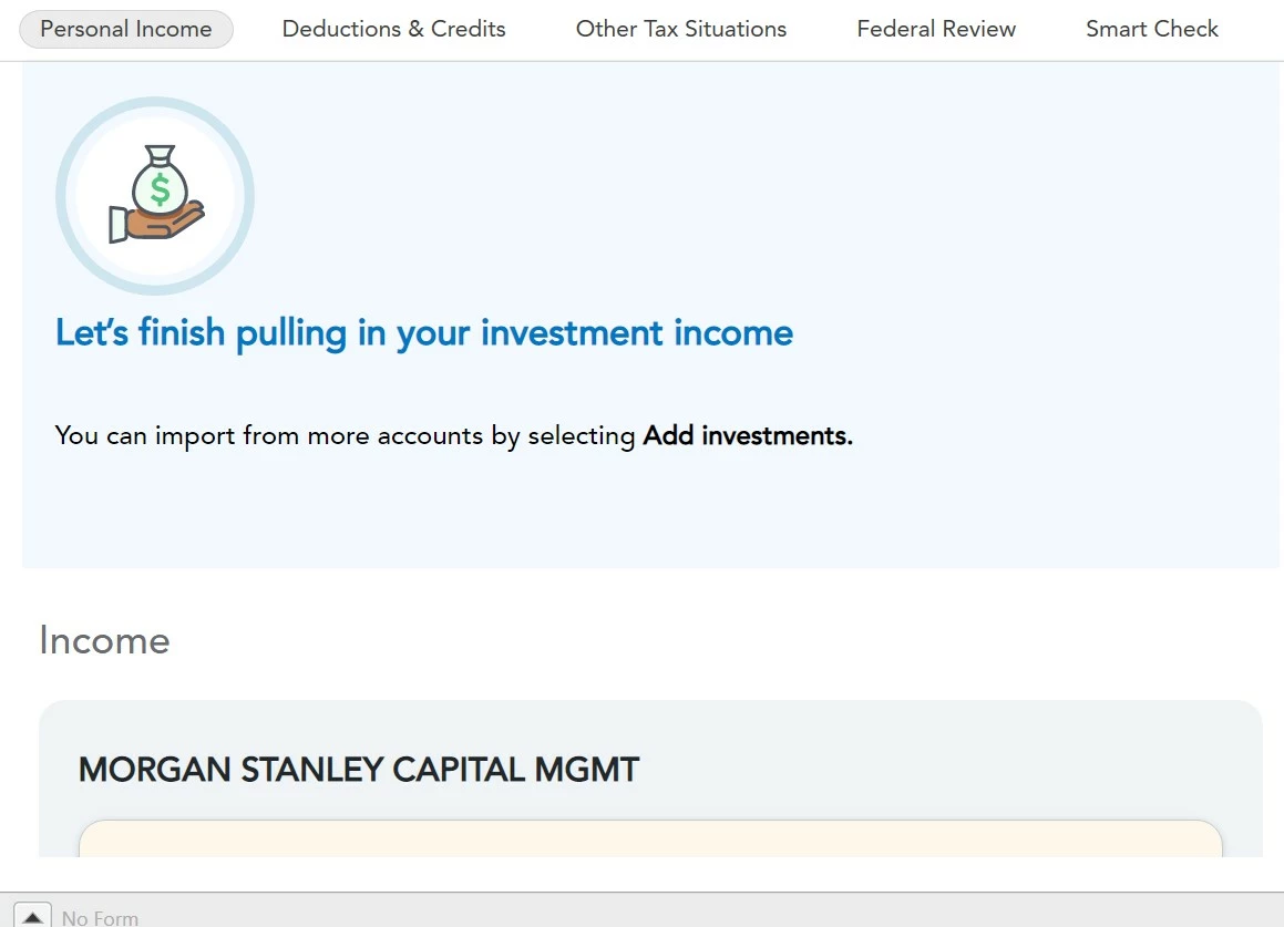 2)  I clicked the Review button for one of the forms, but instead of opening info for that form so that I could review it,  TT went back to the screen asking me to enter the name of a bank or brokerage to download from.  WHY??  That just added to the confusion.  The Review button ought to at least go to a screen like ITTHatter's  Picture 2.