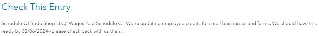 I have been using Turbotax self-employed Online for over 5-year. I have no any issue to file tax before. However, this year (2024),  at the review step, I get the Schedule C error message "we're updating employee credits for small businesses and farms, please check back with us XXX." (the check back date is always 1 week later when I check every day)