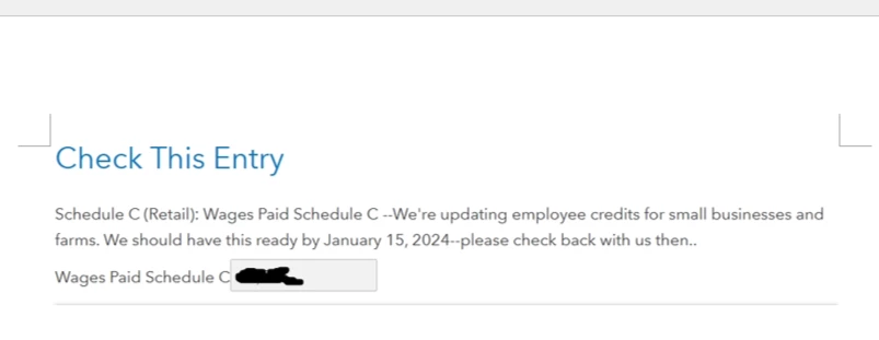 Schedule C Wages for Employees is showing an error to review the amount listed. I check it and it matches what's is listed and reported on my W-3. I do not have any credits for Work Opp Cr Fm 5884 or Other Work Credits. However, once I hit continue, it does not clear the error and I am unable to file. The form stated it was to be ready on January 15, 2024.