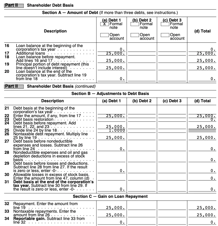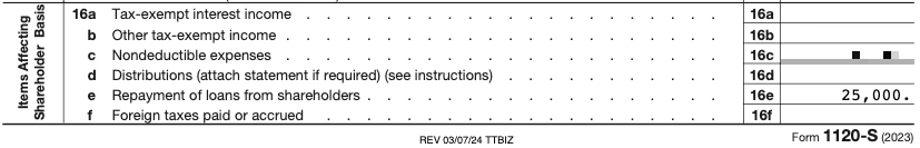 Going through the Step-by-Step in TurboTax Business Desktop, I responded that there were $25,000 in repayments of loans made by shareholders. During the accuracy check, I was brought to the S Corporation Shareholder Stock and Debt Basis Limitations Worksheet as a few other fields were red and needed to be filled out. See below: