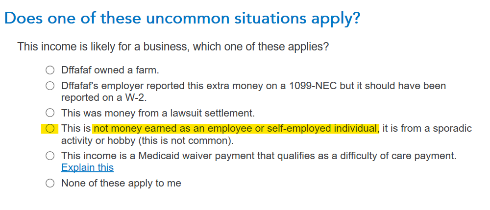 it keeps asking how im self employed. this was for trial study research compensation. Can someone help me with getting this entered?