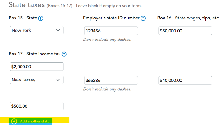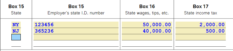 You can add another line of state taxes, if needed. Box 16 is the wage base and Box 17 is the amount of tax withheld. You can have multiple states listed on a W-2. See example below: