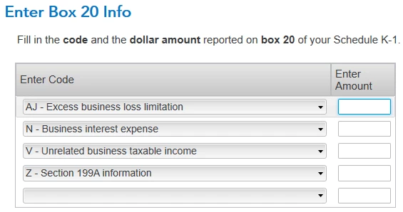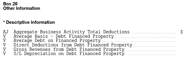 I received Schedule K-1 and Box 20 shows "AJ* STMT", "N* STMT", "V* STMT" and "Z* STMT". On page 2 of K-1, there are information for these codes, specifically code V has (1) Average Basis - Debt Financed Property, (2) Average Debt on Financed Property, (3) Direct Deductions from Debt Financed Property, (4) Gross Revenues from Debt Financed Property, and (5) S/L Depreciation on Debt Financed Property. Each of these 5 items has a $ value. In TurboTax desktop, I am required to enter an amount as shown below. Do I need to enter the sum of these 5 items for code V below?