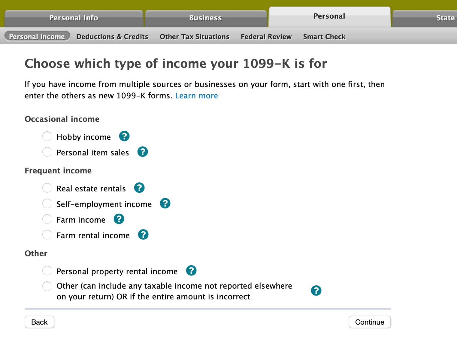 1. Should I choose Self Employment income in the screenshot below?