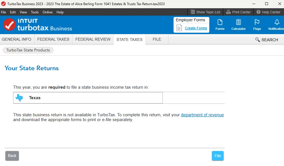 I'm using TT Business 2023 (desktop version) to file the final federal income tax return (Form 1041 for Estates and Trusts) for a person that died in 2023. The return is very simple, having one income item (Schedule K-1) and one deduction. After completing the federal review portion, TT moves to State Taxes where it declares: "This year, you are required to file a state business income tax return in Texas. This state business return is not available in TurboTax. To complete this return, visit your department of revenue and download the appropriate forms to print or file separately.