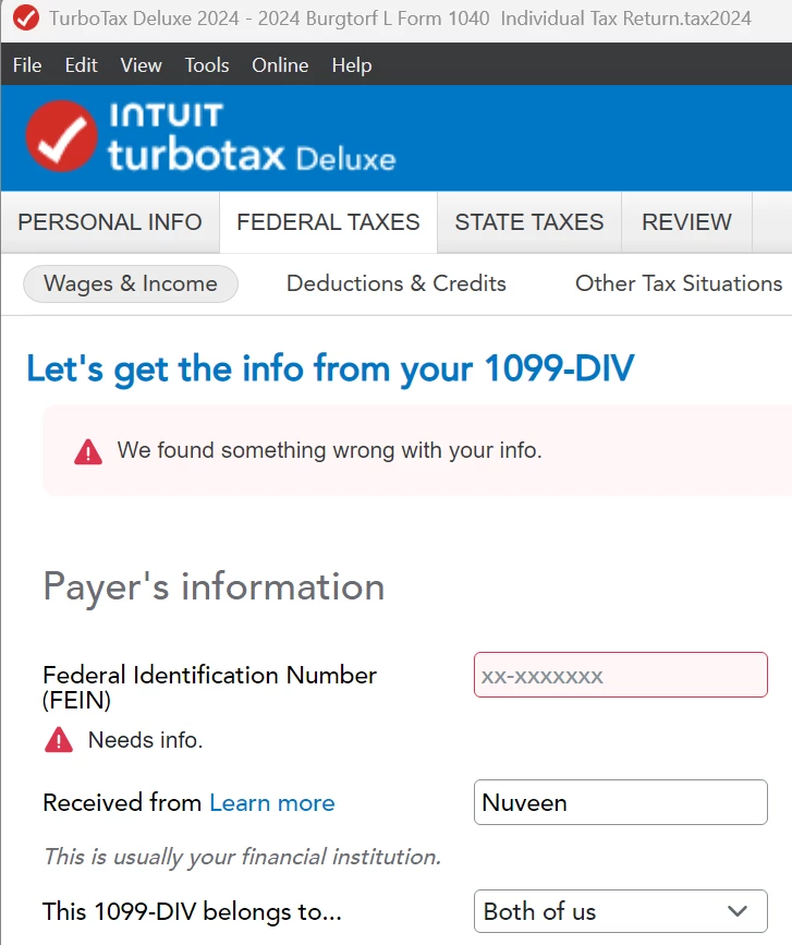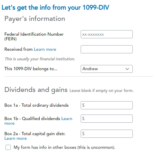 I am attempting to input information for two 1099-DIVs that I received. The 1099-DIV looks exactly the same ask the past 4 years from this institution (went back to check). When I get to the page in TurboTax, the only option I have is to insert the FEIN and hasn't been in previous years either.