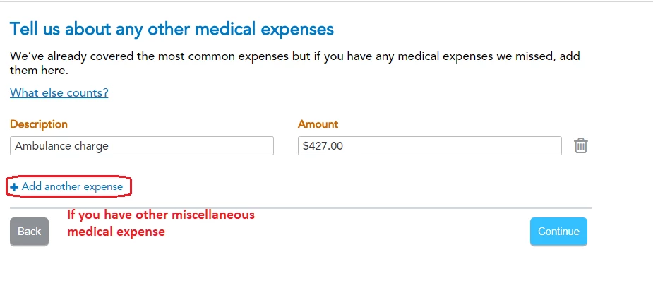 Near the very end of the medical expense section there is a place where you can list any miscellaneous medical expense that didn't fit nicely into one of the categories, and you can specifically notate it there as ambulance expense. In the end, TurboTax lumps all the allowable expenses together to report on your return. The categories are mainly to remind you to include everything. See this image below for entering a custom expense. Your screen may not look exactly like this image from desktop TurboTax, but the principle is the same.