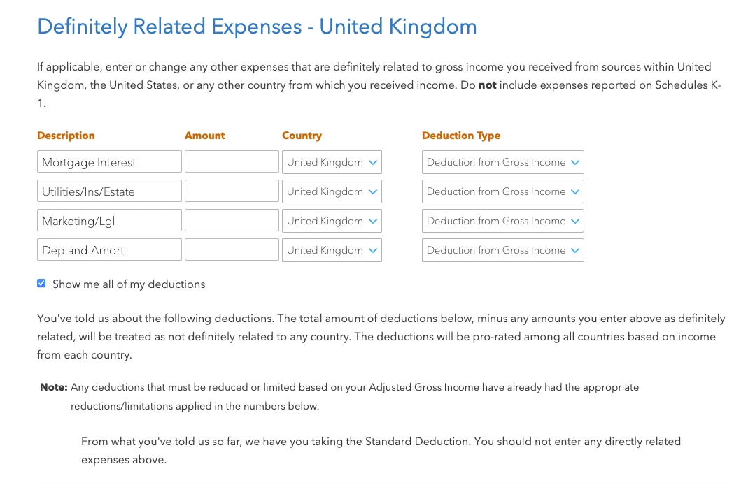 - At this screen it asks for "Definitely related expenses", which I assume means all of the mortgage expense etc. All of these expenses are recorded in Schedule E where they should be
