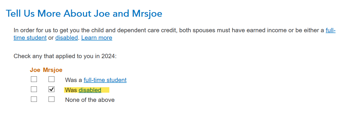 I am trying to enter information for form 2441 to claim credit for husband's cost of care in 2024. He was not able to take care of himself while I worked. When I choose his name from the drop down it tells me he is not a qualified person. However, I filed this same form in 2023 using Turbo Tax. How do I get the interview to proceed?
