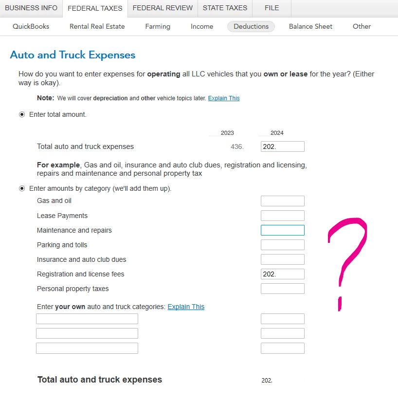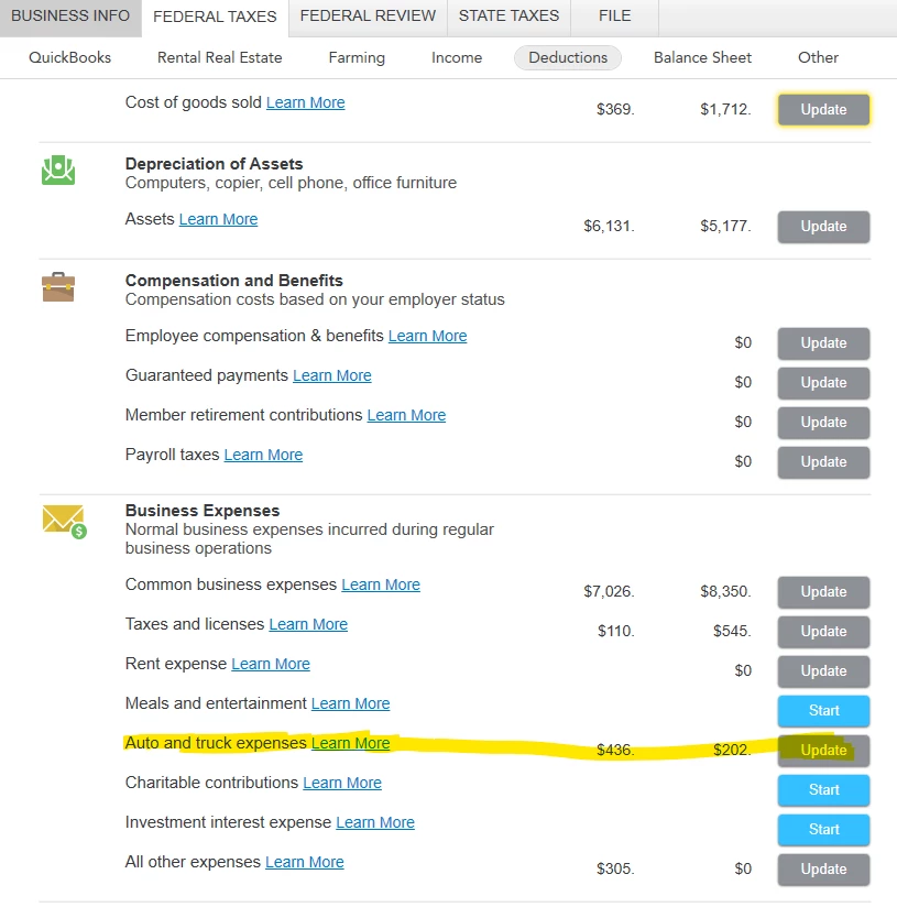 (Note: The software asks for business AND personal miles, why? that is how the program determines the percentage you use the vehicle for business. This matters for depreciation, although if you use the Standard Mileage rate, the depreciation is built into the rate.)