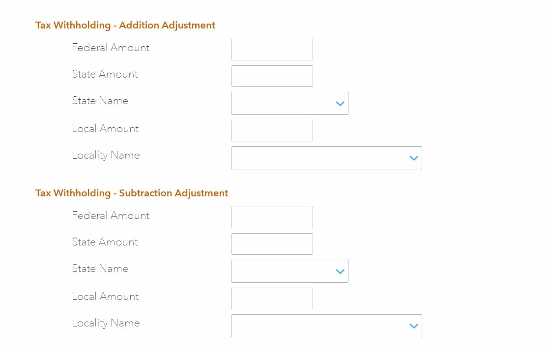 And in the second image, I would do the same thing with tax (most likely a subtraction adjustment for Bob) withholding right? Another issue I noticed is that when I enter a positive value in the Tax Withholding - Subtraction Adjustment federal, state, and local amount fields, it says "maximum value is 0". I was wondering why this happens. Am i supposed to put a negative value? e.g. -300