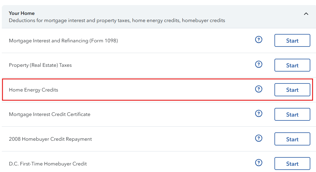 In TurboTax, you'll enter the details about your purchase in the Deductions & Credits section. Look for Home Energy Credits under the Your Home section.