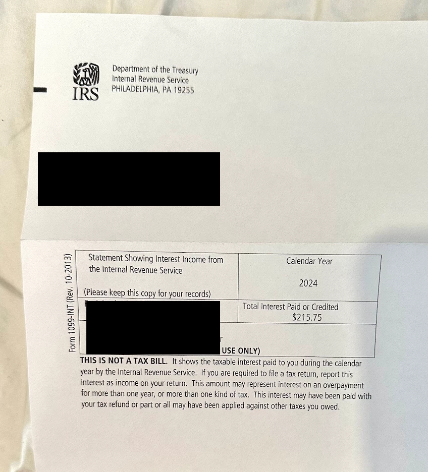 The letter I received from the IRS is form 1099-INT. I am not sure why I received this letter, but it says "Total interest paid or credited: $215.75"