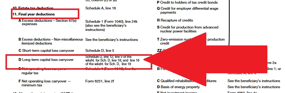 I received a K-1 1041 from a trust which my wife was a part of an inheritance. It's showing in Box 11 😧 $73,300. (Long-Term Capital Gains Gain) . We have a Capital Gains Loss from previous year that exceeds this amount, however TurboTax is showing that we owe money.