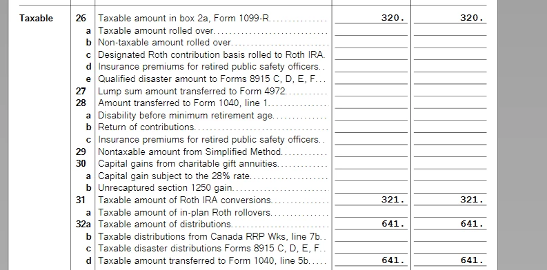 line 321 (Taxable amount of distributions) shows 640 instead of 320