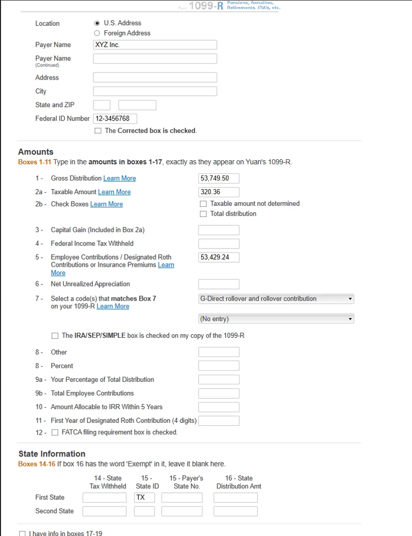 The value of two boxes of the 1099-R must add up to 53749.50 (as long as box 1 is correct).