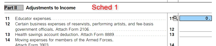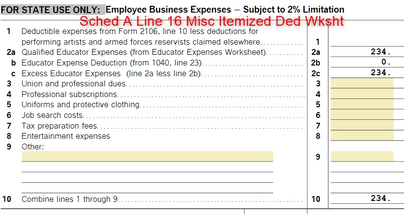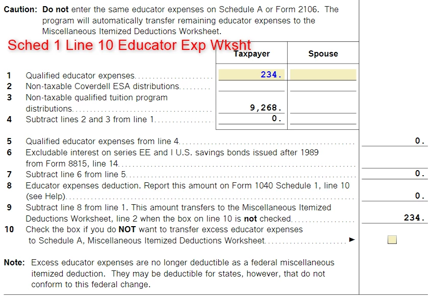 I have unreimbursed teacher expenses as a K-12 teacher assistant. Looking at the forms, I see that the $234 is entered into the educator expense worksheet. Then sched A sees it but the section shown appears to be only for state returns and subject to the 2% limitation. Since I don't itemize the sched A isn't really relevant. I just want to show that TT is still using the number. But when I look at the Schedule 1 line 11, Educator Expenses is $0.