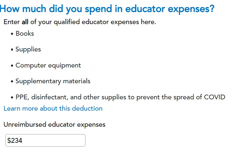 Earlier you told us you have $0 in teacher (educator) expenses, so there’s nothing to deduct. You can go back and enter a different amount or keep going.
