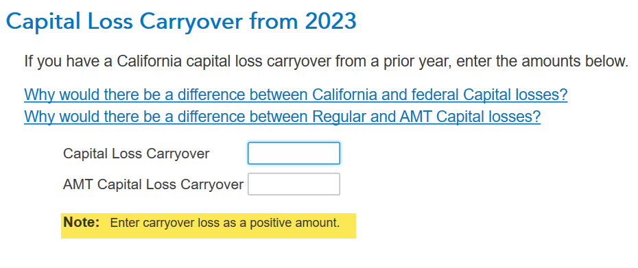 Turbotax 2024, interpreting wrongly the carryover capital loss for california tax return