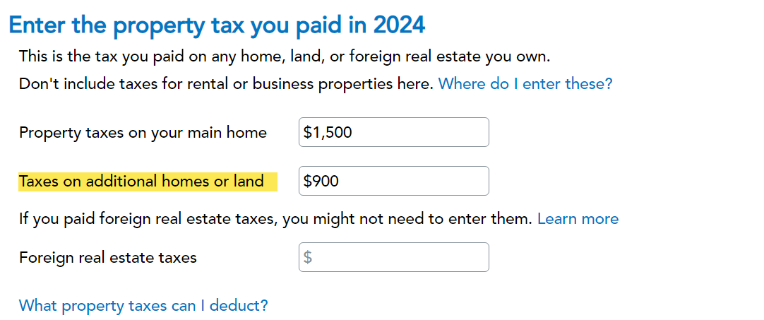You enter those in the same place you enter taxes paid on your main home, in the Deductions and Credits section, then Your Home, then Property Taxes. Find the page that says Enter the property tax you paid in 2024, you will see an option to enter Taxes on additional homes or land: