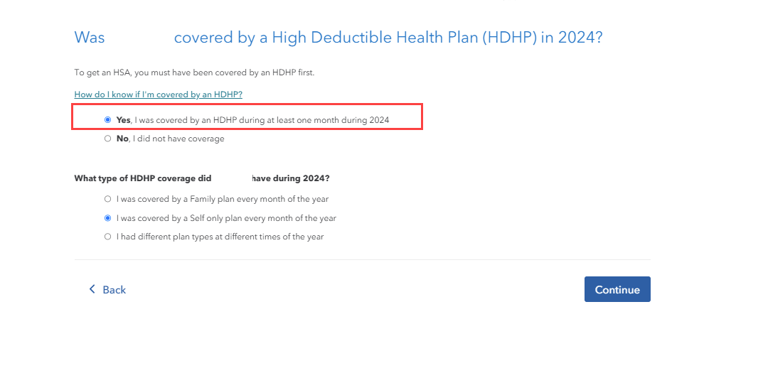 Continue on, until you are asked if you were covered by a High Deductible Health Plan (HDHP) in 2024? Answer this question and indicate the time period of coverage.