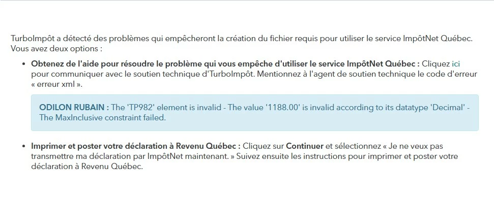Je n'arrive pas à soumettre ma déclaration d'impôt. On m'affiche le code d'erreur « erreur xml », à chaque tentative. Que faire?