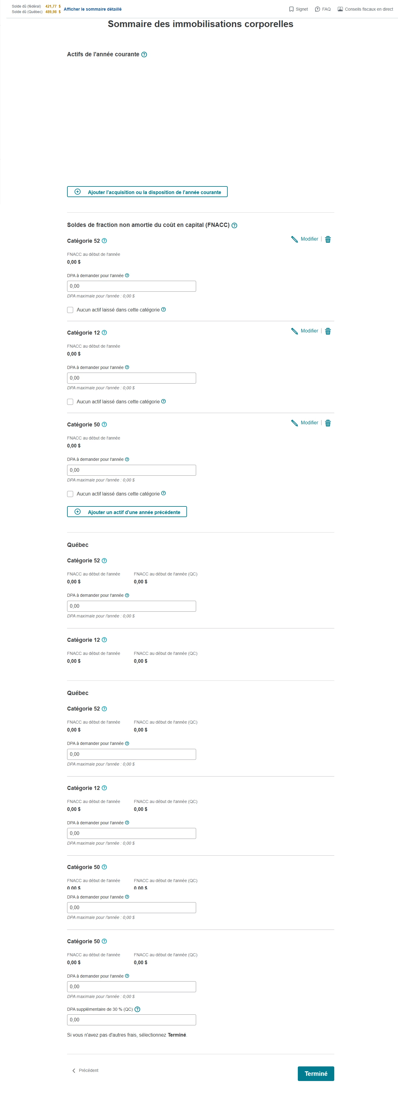 De plus, je vois deux fois la catégorie 52 (une pour le fédéral et une pour le provincial, j’imagine ?), et il semble que je ne puisse pas ajouter les actifs séparément, seulement inscrire un montant total.