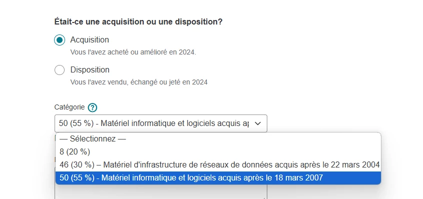 J’ai fait un test en entrant les actifs individuellement, mais seules les options de la catégorie 50 sont offertes. Même si je coche que les actifs sont admissibles à la catégorie 52 au Québec, cela ne change rien : les montants restent dans la catégorie 50.