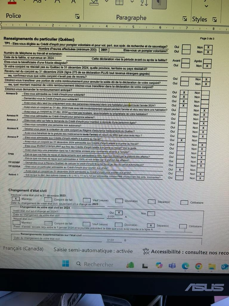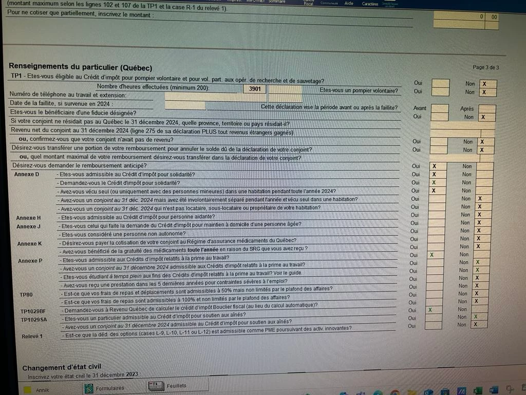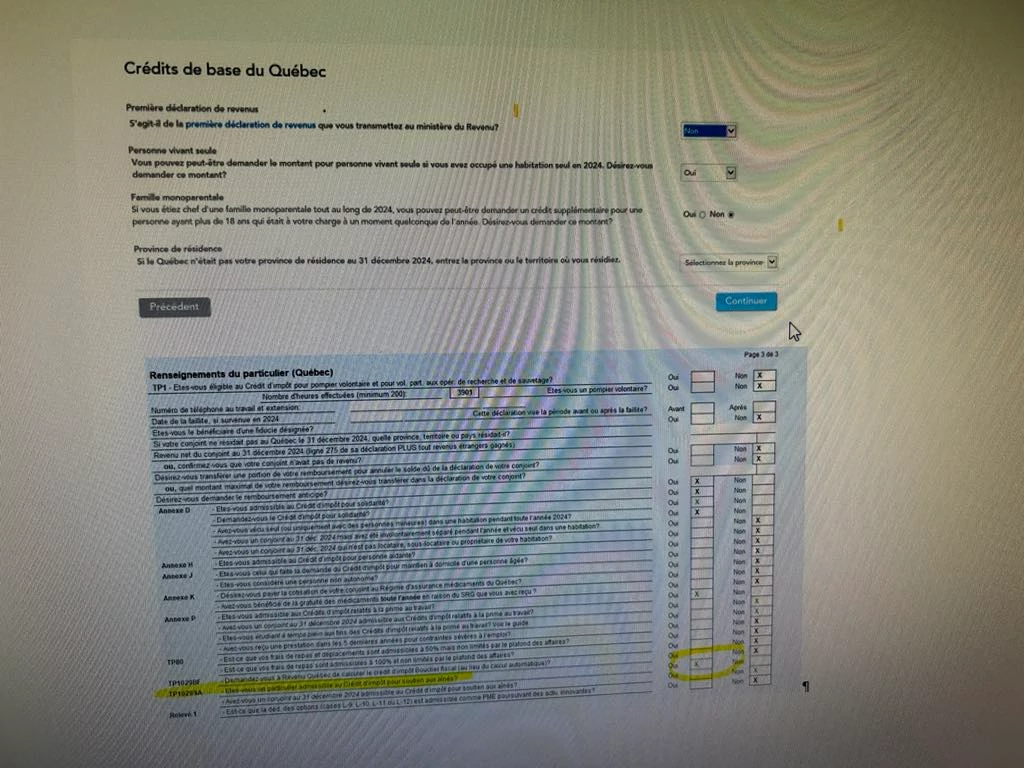 Pour le crédit d'impôt pour soutien aux aînés, le OUI semble être coché par défaut pour toutes les déclarations, mais le calcul ne se fait pas pas si la personne n'a pas 70 ans ou plus au 31 décembre 2024. Lorsqu'une personne a 70 ans et plus, une case se coche automatiquement dans le formulaire TP-1029.SA et fait le calcul.