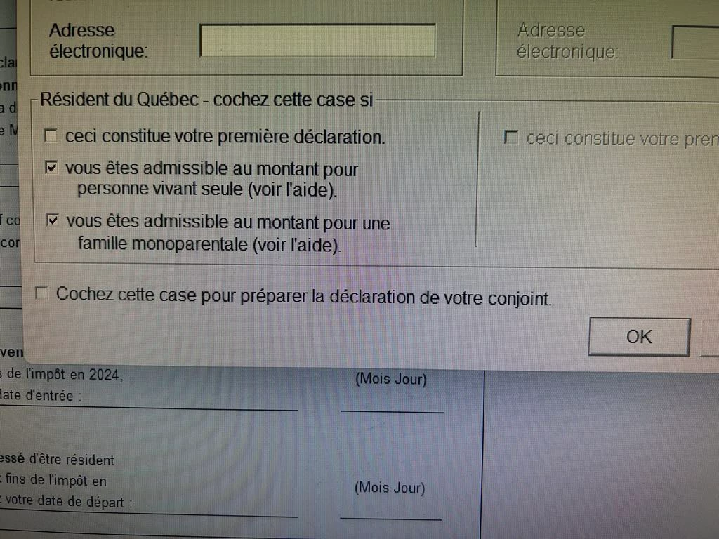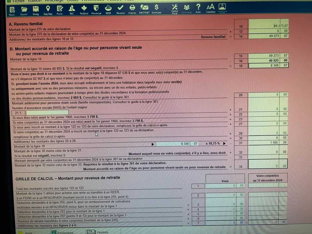 Je vois que vous avez coché "Vous êtes admissible au montant pour une famille monoparentale". Ce titre est trompeur, c'est lié à un parent qui a un enfant majeur. Le guide provincial TP-1.G(2024-12) est bien fait et est disponible en ligne. Pages 46-47 pour la ligne 361 de la déclaration.
