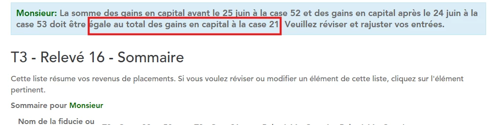 erreurs relatives à IMPÔTNET ont été détectées. La somme des gains en capital avant le 25 juin à la case 52 et des gains en capital après le 24 juin à la case 53 doit être égale ... je clique sur le bouton Résoudre et je mets les deux montants égaux