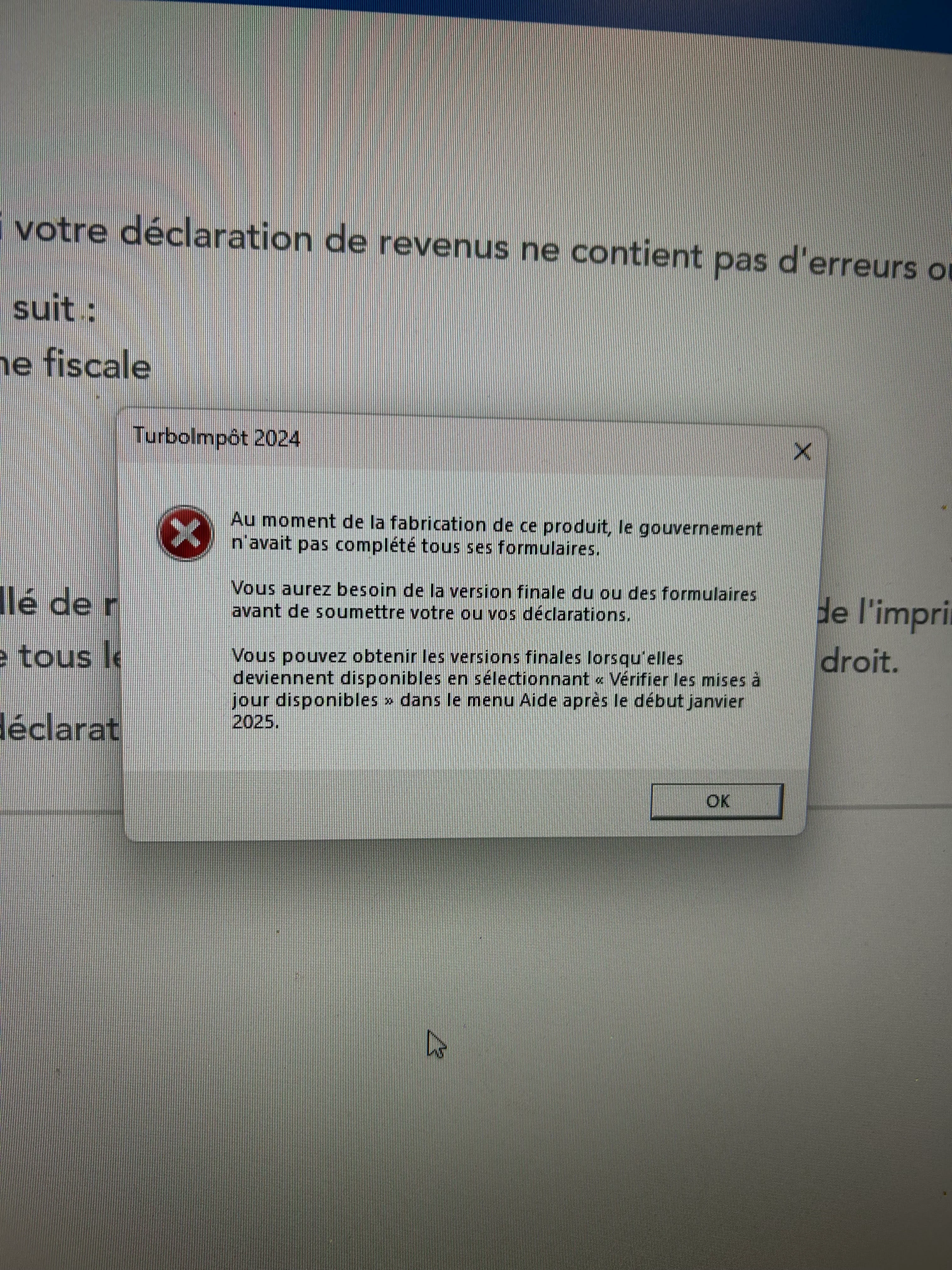 Voir la photo, incapable d'envoyer la déclaration en date d'aujourd'hui le 27 fév ni d'enregistrer en PDF . J'utilise le logiciel 20 déclarations à 179.99$