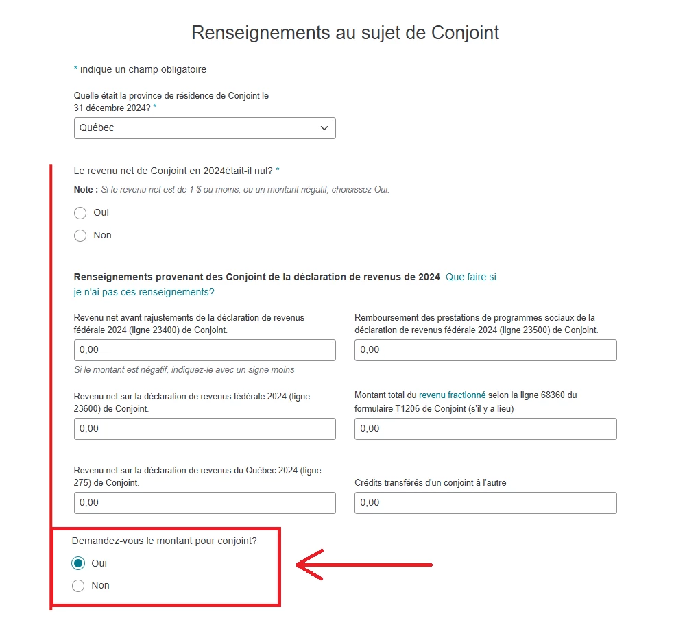 Vous pouvez également annuler la demande de ce crédit en répondant "Non" à la question "Demandez-vous le montant pour conjoint."