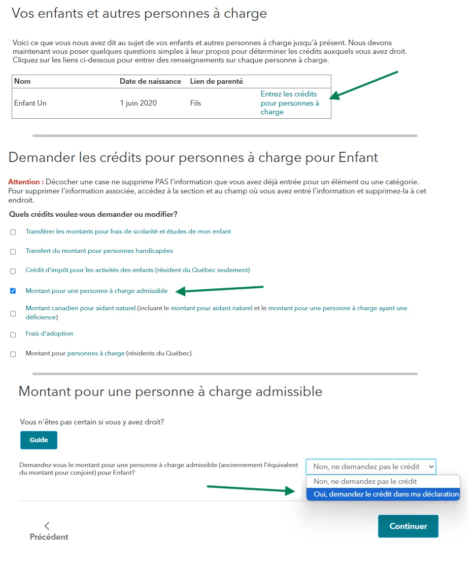 Montant pour personne à charge admissible (ligne 304) Finalement, j'assume que vous avez bien identifé que vous vouliez réclamer ce crédit pour cet enfant.