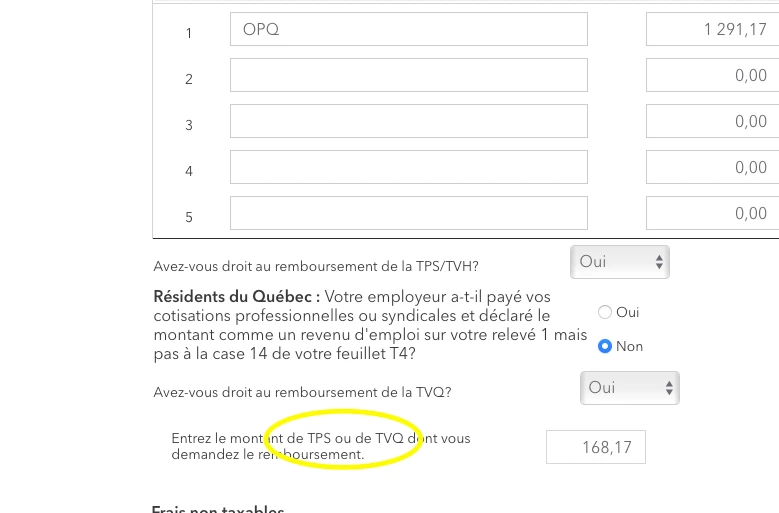 Dans la version en ligne de TurboImpot, le formulaire de saisie des cotisations syndicales et professionnelles manque de précision. Dans une case, il faut saisir le total de la TPS et TVQ payées sur les cotisations, mais le texte dit d'entrer le montant de "TPS ou TVQ", mais ça devrait plutôt être le montant "total de TPS et TVQ" payés pour que tous les calculs qui en découlent soient exacts. Je suggère que le texte soit corrigé.