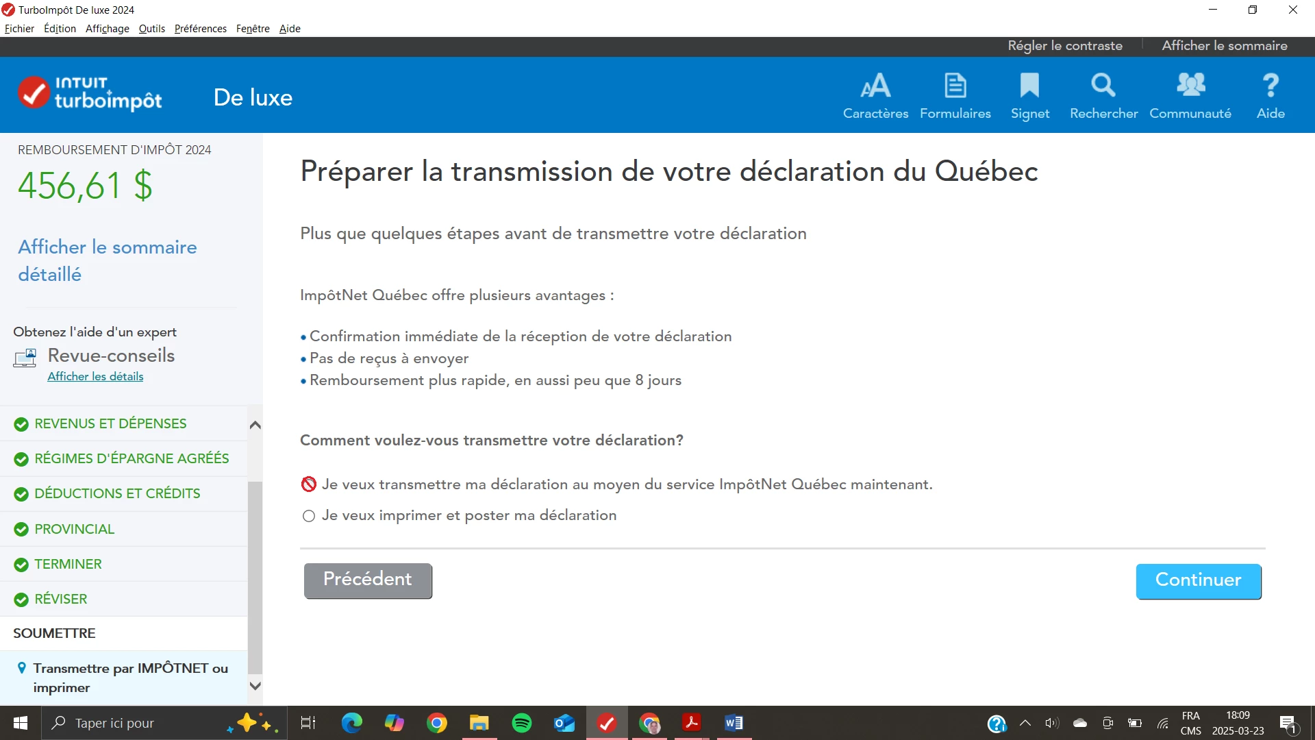 Je ne peux pas choisir le bouton pour produire ma déclaration au Québec, est ce en lien avec ses informations de dépot direct ? je ne comprend pas. Merci de votre aide