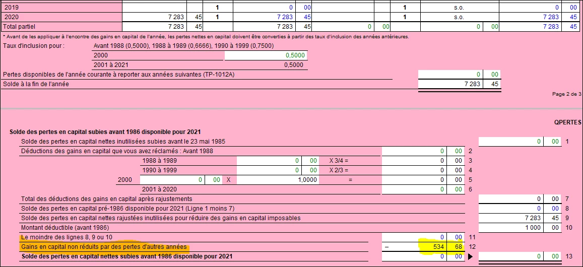 J’ai une perte en capital d’enregistré il y a 2-3 ans que je peux reporter aux années futures à l’encontre d’un gain en capital. Cette année j’ai un gain en capital et je veux profiter du report de cette perte pour ne pas être imposé sur ce gain. J’ai entré les informations et j’ai la déduction qui parait sur la déclaration fédérale mais elle ne parait pas sur la provinciale… Comment je fais pour qu’elle s’enregistre aussi au provincial?