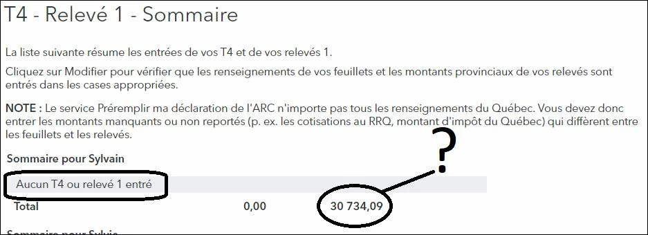 Pour une raison que j'ignore ma déclaration de revenu Québec indique un revenu d'emploi de $30,734 alors que je n'aii aucun revenu d'emploi étant retraité depuis 4 ans. Comment puis-je faire pour "effacer" un montant que je n'ai pas entré? Ça indique bien que aucun T4 ou relevé 1 n'a été émis. Je ne peux donc détruire quelque chose qui n'exisete pas. Comment puis-je faire pour effacer cette somme ou ramené à $0.00 ce montant?