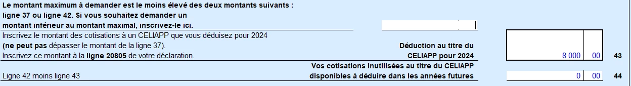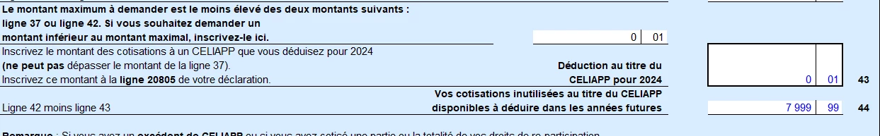 Par contre, j’ai réussi à corriger le problème en faisant une entrée directe dans le formulaire de l’annexe 15. Au lieu d'inscrire le montant inférieur à demander de 0,00$, j'ai laissé la ligne vide et fait une entrée directe de 0,00$ à la ligne 43 pour la déduction au titre du CELIAPP pour 2024. La ligne 44 pour les cotisations à déduire dans les années futures s'est calculée automatiquement et est devenue 8000$, comme prévu.